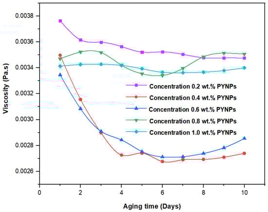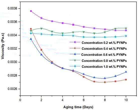 These values, which represent the CMC concentration for PYNPs and CSNPs, were confirmed by measuring the viscosity of the hybrid polymer solution for different concentrations of nanoparticles (0.2 to 1 wt.%) for a period of 10 days. As shown in Figure 11, the viscosity of PYNPs was approximately stable during this period when the concentration of PYNPs was 0.6 wt.%, except on the first day, where the value was somehow higher than the others. As seen in Figure 12, the viscosity of CSNPs did not change much when the concentration of CSNPs was 0.8 wt.%. This provided further confirmation about CMC values obtained earlier from IFT measurements. Therefore, these values are considered as the optimum concentrations for the two types of nanoparticles in the polymer solution.