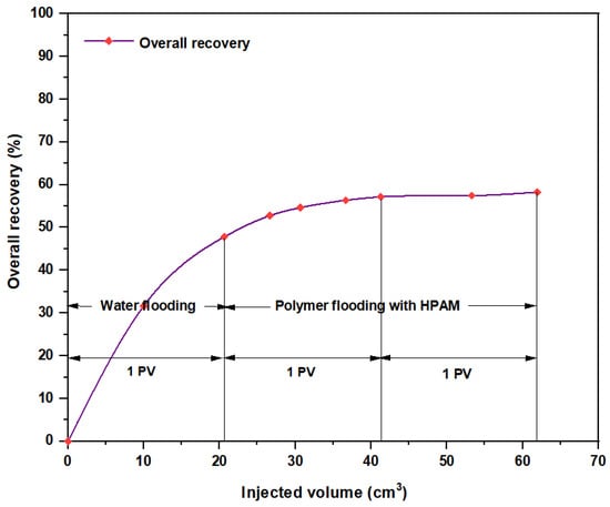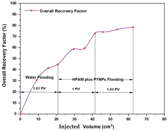 Overall oil recovery versus injected volume from water and polymer flooding at 60 °C. The polymer solution consisted of 2000 ppm of HPAM and 0.60 wt.% PYNPs.
