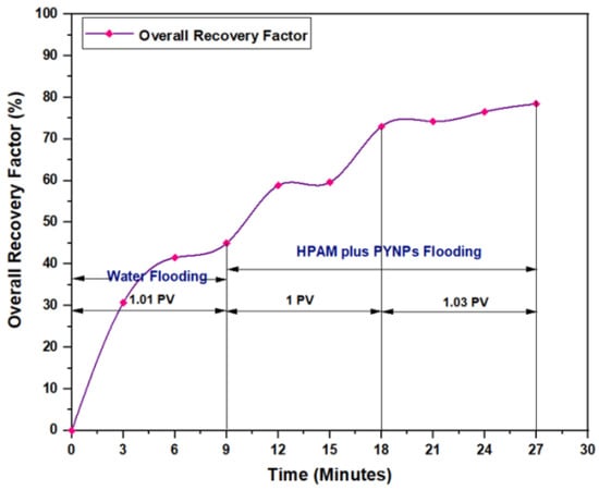 Overall oil recovery versus time of injection from water and polymer flooding at 60 °C. The polymer solution consisted of 2000 ppm of HPAM and 0.60 wt.% PYNPs.