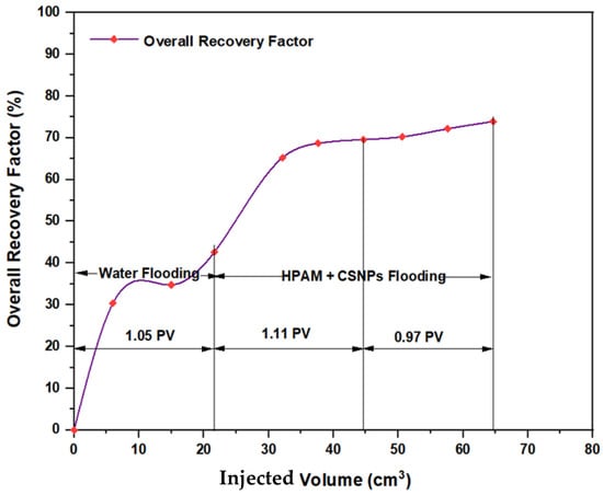 Overall oil recovery versus injected volume from water and polymer flooding at 60 °C. The polymer solution consisted of 2000 ppm of HPAM and 0.80 wt.% CSNPs.