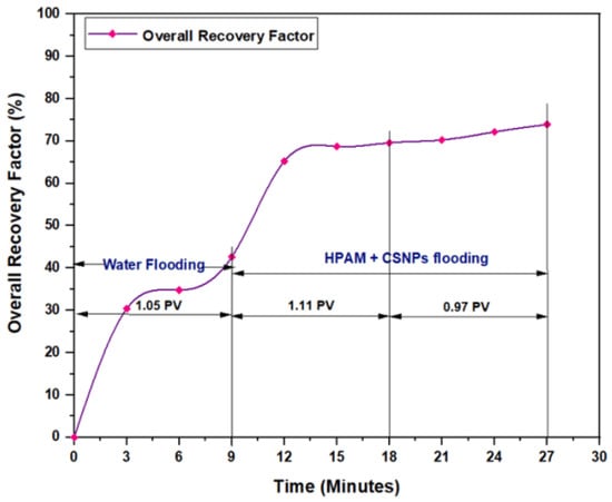 Overall oil recovery versus time of injection from water and polymer flooding at 60 °C. The polymer solution consisted of 2000 ppm of HPAM and 0.80 wt.% CSNPs.