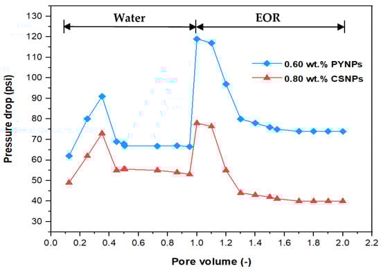 The pressure drop profile versus the pore volume for the complete flooding operation for the injected solutions is shown in Figure 19. The pore volume resulted from dividing the injected volume of the solutions (cm3) by the core’s pore volume (20.64 cm3). When water flooding was initiated at the beginning, there was a rise in the pressure drop, followed by a decline, until it became constant after a certain time and remained stable until the end of water flooding. The reason behind the declining trend was due to the high mobility of water in comparison to that of oil. When the EOR injection was commenced, the pressure drop began to rise for both polymer solutions, but the rise was higher for the solution that contained 0.60 wt.% PYNPs. In fact, the recovery of oil improved with the increased pressure drop, and therefore, the polymer solution that contained 0.60 wt.% PYNPs was more efficient in expelling oil than the other solution. Increasing the pressure drop showed that the PYNPs solution lowered the capillary forces that hold the oil in the pore spaces [41]. Additionally, the rise in the pressure drop during CSNPs injection occurred due to the improved viscosity for this solution, in comparison with water [42,43]. A favorable trend of oil displacement occurs when: