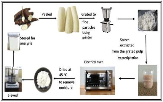 A total of 1 kg of native cassava starch was purchased from a local market in Johor. Cassava is a versatile root vegetable that is widely consumed in several parts of the world, and it is also what tapioca starch is made from. Cassava starch is a white powder made from tapioca that has been dehydrated and dried after being extracted.