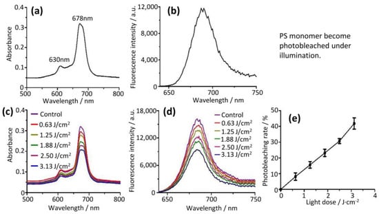 The PS aggregate in an aqueous solution was disassembled into a PS monomer with either detergent (0.05% tween20) or a lysis buffer (0.1 M NaOH/1% SDS). The PS monomer showed a main absorption at 678 nm (Figure 3a) and strong fluorescence (lexc = 610 nm, lem = 680 nm) (Figure 3b) [13,14]. This PS monomer was significantly photobleached (Figure 3c,d) under conditions identical to that used for the PS aggregate (Figure 2). The photobleaching rate of the PS monomer was up to 41.84% at a light dose of 3.13 J/cm2 (Figure 3e). Nevertheless, the PS monomer rather than the PS aggregate showed photodynamic efficacy (see below).