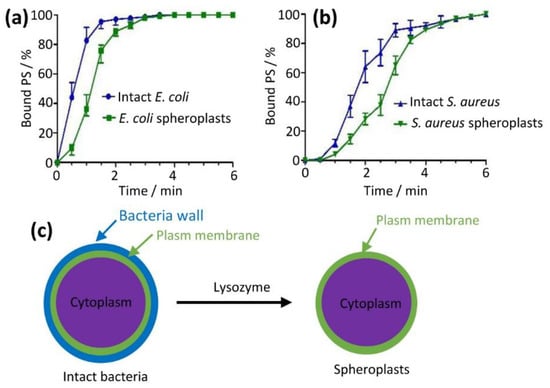 PS aggregate adsorption kinetics on cell ((a) for E. coli and (b) for S. aureus) measured by flow cytometry. Binding kinetics of PS aggregate on intact bacteria were faster compared to bacterial spheroplasts that were prepared as shown in (c).