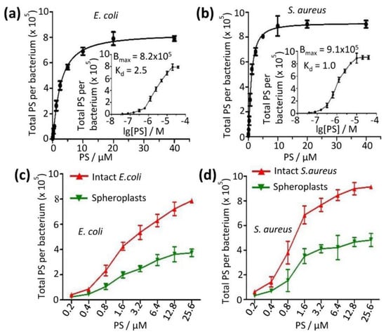 We first measured the binding affinities of the PS aggregate on bacteria. The PS aggregate at increasing concentrations (0.039 to 40 µM) was added to bacterial suspensions and incubated with bacteria, and the total bound PS aggregate was quantified after washing out the unbound PS aggregate and lysing bacteria. The total bound PS molecules increased (0.1 × 105 to 7.9 × 105 per E. coli cell, and 0.1 × 105 to 9.0 × 105 per S. aureus cell) upon increasing PS aggregate concentrations (Figure 6a,b). The PS aggregate binding to E. coli was slight tighter than to S. aureus (equilibrium constant (Kd)—2.5 µM for E. coli vs 1.0 µM for S. aureus, Figure 6a,b). The number of PS aggregates bound to bacteria was the opposite: more on S. aureus than on E. coli (maximum adsorption (Bmax)—9.1 × 105 vs. 8.2 × 105, Figure 6a,b).