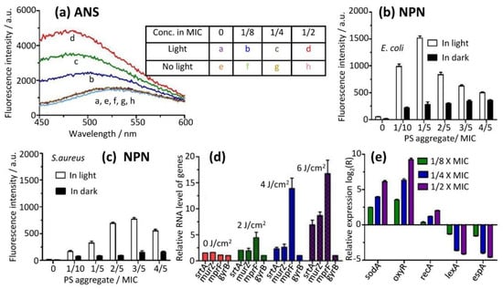 Disruption of cell membrane (a–c) and regulation of gene expression levels of related genes (d,e) during PDT of PS monomer released from its aggregate. (a) The fluorescence intensities of probe anilinonaphthalene-8-sulfonic acid (ANS) were measured with (trace a–d) or without light (e–h). (b,c) PS increased membrane permeability of E. coli (b) and S. aureus (c), measured under illumination using another fluorescence probe N-phenyl-1-naphthylamine (NPN). (d,e) Gene expression was quantified by RT-qPCR. Relative expression levels of genes related to cell wall and membrane biosynthesis were measured at different light doses (d). Expression levels of genes related to bacterial oxidative stress were measured under three sessions of separated illumination with various PS aggregate concentrations. The relative expression ratio was represented as a log2 value. A ratio greater than zero indicated up-regulation of gene expression, while a ratio below zero indicated down-regulation. In the experiments, MICs of PS aggregate towards E. coli and S. aureus were 1.6 and 0.8 µM, respectively.