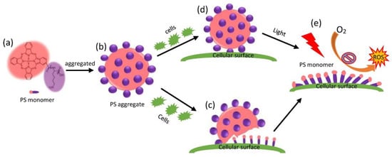 Cell or light-triggered disassembly of PS aggregation to generate PS monomer, leading to enhanced photodynamic inactivation toward cells. Monomeric PS (a) was formed into PS aggregation (b) to increase the photostability. (c) Cells induced disassembly of PS aggregation, generating monomeric PS on cellular surface. (d) Light also promoted the release of monomeric PS from bound PS aggregation. (e) Monomeric PS were bound to cellular surface, and were in charge of generation of ROS, leading to cellular death in PDT.
