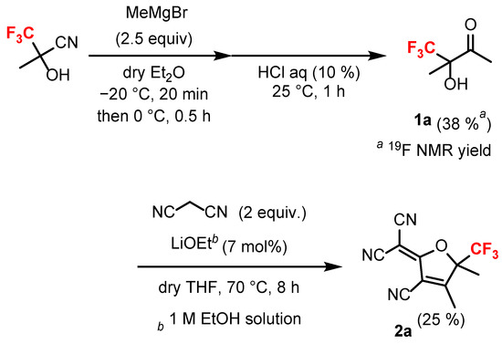3.4. Synthesis of 2-(2-Cyano-3,4-dimethyl-4-(trifluoromethyl)cyclopent-2-en-1-ylidene)malononitrile (2a) [42]