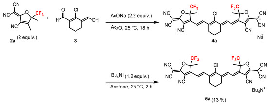 3.6. Synthesis of Sodium ((Z)-4-((E)-2-(2-Chloro-3-((E)-2-(4-cyano-5-(dicyanomethylene)-2-methyl-2-(trifluoromethyl)-2,5-dihydrofuran-3-yl)vinyl)cyclohex-2-en-1-ylidene)ethylidene)-3-cyano-5-methyl-5-(trifluoromethyl)-4,5-dihydrofuran-2-yl)dicyanomethanide (4a)