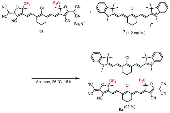 3.10. Synthesis of 2-((E)-2-((E)-2-Chloro-3-(2-((E)-1,3,3-trimethylindolin-2-ylidene)ethylidene)cyclohex-1-en-1-yl)vinyl)-1,3,3-trimethyl-3H-indol-1-ium ((Z)-4-((E)-2-(2-chloro-3-((E)-2-(4-cyano-5-(dicyanomethylene)-2-methyl-2-(trifluoromethyl)-2,5-dihydrofuran-3-yl)vinyl)cyclohex-2-en-1-ylidene)ethylidene)-3-cyano-5-methyl-5-(trifluoromethyl)-4,5-dihydrofuran-2-yl)dicyanomethanide (8a)