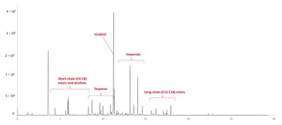 Representative HS-SPME-GC-MS chromatogram of volatile compounds identified in a 1st day Muscat of Alexandria grape must.