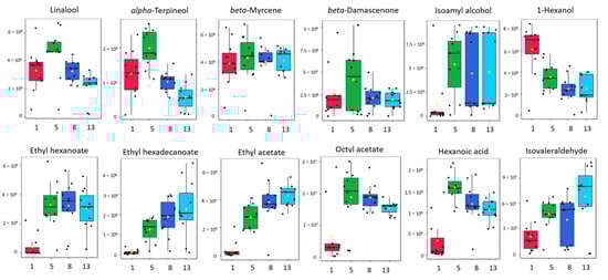 Boxplots illustrating the change of certain marker molecules during alcoholic fermentation: representative terpenes, C13-norisoprenoids, alcohols, ethyl and acetates esters, acids, and aldehydes.
