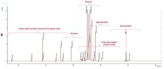 Grape must is largely composed of sugars (~about 200 g L−1 at the beginning of fermentation), making it difficult to detect less concentrated metabolites. High-throughput analysis and accurate identifications of hundreds of metabolites in a single analysis are just some of the factors that make GC–MS a very good choice for mapping the profile of musts during alcoholic fermentation. However, unstable or not sufficiently volatile or non-derivatized metabolites are not amenable to analysis by GC-MS. With the proposed method, 69 metabolites were identified, including mainly sugars and sugar alcohols, organic acids, and four amino acids; a chromatogram of a 1st day of fermentation grape must sample is presented in Figure 4.