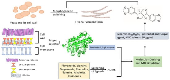 Candida is an opportunistic fungal pathogen that causes a substantial amount of mortality worldwide in immunocompromised patients suffering from diabetes, cancer, AIDS, organ transplantation, and other immunosuppressive conditions. Candida is the most predominant fungal pathogen involved in both superficial and systemic infections and is the third most commonly isolated bloodstream pathogen in hospitalized patients [1]. Candida albicans and emerging non-albicans Candida (NAC) species such as C. glabrata, C. parapsilosis, C. tropicalis, and C. krusei can cause superficial infections of the oral and vaginal mucosa, as well as disseminated bloodstream and deep-tissue infections [2]. Antifungal agents such as azoles and polyenes exhibit serious side effects and toxicity in the host; thus, there is an urgent need to explore novel antifungal agents. Currently, limited antifungal drugs are available for the treatment of fungal infections, while the emergence of drug-resistant strains is increasing [3]. A promising drug target in antifungal drug discovery is represented by exo-1,3-β-glucanase [4]. This enzyme is involved in cell wall remodeling of Candida spp. [5]. The cell wall of Candida spp. is highly dynamic in nature and forms the outermost layer of the cell. It helps to maintain the shape and integrity of the cell and forms various interactions with host cells [6]. The cell wall of Candida spp. is mainly composed of polysaccharides, glucan, chitin, and mannan, which form the outer fibrillar layer. The central core of the cell wall is made up of a polymer of β-1,3-glucan, which is a branched glucan with β-1,6 branch points to which chitin and galactomannan are covalently attached. Mannans are often associated with proteins and lipids and represent 30–35% of total cell wall polysaccharides [7,8]. Cell wall protein function during cell wall assembly is crucial for remodeling and adhesion to the host cell, abiotic surface, biofilm formation, invasion of epithelial tissues, and is also pivotal in escaping the mechanism of host immune systems. In addition to this, the cell wall contains various enzymes, including chitinases, glucanases, peptidases, and glycosyltransferases that are generally involved in the remodeling of the cell wall, thus providing flexibility and mechanical strength during cell growth or lysis in response to oxidative stress [8]. β-1,3-glucan and β-1,6-glucan are the major components of the cell wall and account for 40% and 20% of total component, respectively. β-1,3-glucan hydrolyzing enzymes are classified into two types, such as exo-1,3-β-glucanases and endo-1,3-β-glucanases. endo-1,3-β-Glucanase cleaves inside a glucan chain to release small oligosaccharides, while exo-1,3-β-glucanase releases glucose monomers from the non-reducing end as a sole product [5]. In C. albicans, three related exo-1,3-β-glucanases, namely, Xog1p, Exg2p, and Spr1p, hydrolytically remove glucose from the ends of cell wall glucans [9,10]. The mechanism of C. albicans Spr1p is not fully understood, but it is expressed specifically during sporulation in Saccharomyces cerevisiae [11]. Exg2p is present during C. albicans cell wall regeneration. Xog1p is the major exo-1,3-β-glucanase associated with the C. albicans periplasmic cell wall. It is a non-glycosylated protein with a molecular mass of ∼45 kDa [12]. The cleavage of long chains of β-1,3 glucan causes softening of the cell wall. This enzyme is involved in cell wall remodeling of Candida that occurs during the swelling and germination of conidia or branching of hyphae [13]. The protein is involved in β-D-glucan metabolism and morphogenesis through its hydrolase and transglycosidase activities [14]. Targeting of this enzyme with sesamin can inhibit the morphogenetic switching of Candida spp. from non-virulent yeast to virulent hyphal form [14,15]. The structural complexity of cell wall components is essential for maintaining the physiology of Candida spp. A study has been conducted in which authors have reported the antifungal activity of edible sesame oil against Candida albicans by determining the effect of different concentrations of sesame oil on mycelial and yeast forms [15]. Targeting the function of the cell wall and its integrity is considered a promising approach to restrict the development of infection processes such as cell adhesion. Natural products are considered important medicinal candidates for the development of drugs because of their lower toxicity and side effects, low drug resistance, high bioavailability (oral intake), and better curative effects [16].