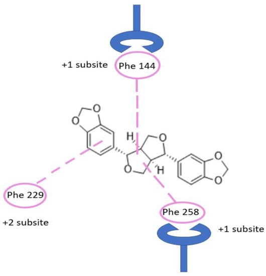 Considering the previously discussed mechanism of exo-1,3-β-glucanase enzyme, we report in Figure 2 the schematic representation of the possible interactions established by sesamin within the binding site of the enzyme. Considering that the residues Phe144 and Phe258 form a distinctive gateway approximately 10 Å up from the floor of the pocket defined by Trp363, this aromatic gateway acts as a clamp to control the entry of β-1,3-glucan substrate and the exit of free glucose product or, alternatively, glucosyl transfer to an acceptor [29]. Carbohydrate–protein interactions at the Phe–Phe clamp of exo-1,3-β-glucanase enzyme provide a major contribution in the transition state interaction energy. This sugar-binding site is crucial for substrate recognition. In the native exo-1,3-β-glucanase structure, the space between the phenylalanine rings is occupied by a series of largely disordered water molecules. The sugar moiety in 4C1 in chair conformation lies parallel between residues Phe144 and Phe258. This pocket is strongly targeted by sesamin (Figure 2 and Figure 3). Finally, the importance of the +1 subsite was observed through site-directed mutagenesis studies of the two phenylalanine residues involved in binding energies derived from kinetic studies [29].