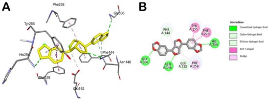 To better describe the dynamic behavior of sesamin within the selected binding site, we analyzed the main contacts formed by the ligand within the active site, reporting the timeline analysis of MD simulation (Figure 5, panel A and B). The H bonds found by docking studies with Asp145 and Asn146 are maintained, although it became sporadically water-mediated. The hydrophobic contacts established by the ligand with Tyr29, Phe144, Phe229, Tyr255, and Phe258 were maintained during the simulation, providing strong hydrophobic network contacts, including several π–π stackings. Furthermore, during the MD simulation, we observed that the ligand established a novel significant H bond with the sidechain of Tyr255, contributing to stabilizing the retrieved binding mode. Overall, the computational outcome of the ligand within the selected binding site indicated that sesamin can behave as a potential ligand of the selected enzyme.