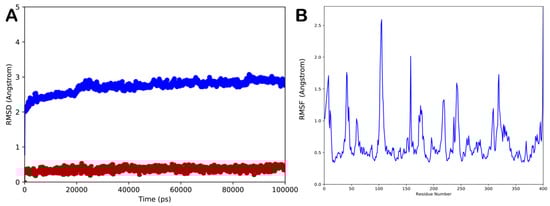 (A) Root-mean-square deviation (RMSD) regarding the protein/ligand complex (blue line for the protein and red line for the ligand); (B) root-mean-square fluctuation (RMSF) of all residues of the protein. Pictures were created by Simulation Event Analysis available in Desmond.