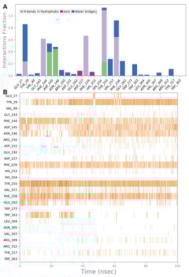 (A) Protein–ligand interactions monitored throughout the MD simulation. The interactions can be grouped into four types: H bonds (green), hydrophobic (grey), ionic (magenta), and water bridges (blue). (B) The diagram illustrates a timeline description of the main interactions. A darker hue of orange indicates that some residues make many distinct contacts with the ligand.