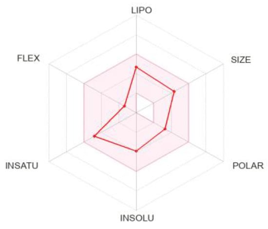 The bioavailability radar plot of sesamin in Figure 6 demonstrates that the pink area is a suitable physicochemical space for oral bioavailability. The colored zone of the suitable physicochemical space shows the value of LIPO (lipophilicity); XLOGP3 (2.68), SIZE (molecular weight 354.35 g/mol), POLAR (polarity 55.38), INSOLU (insolubility, −3.93), and FLEX (flexibility, number of rotatable bonds 6) for the sesamin.