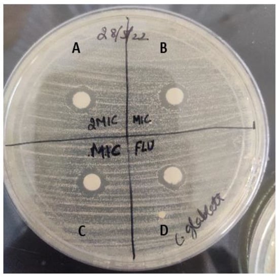 Zone of inhibition formed by drug molecule against human fungal pathogen, Candida glabrata. A represents zone of inhibition at 32 μg/mL of sesamin concentration, B and C represent the zone of inhibition at 16 μg/mL of sesamin concentration, and D represents positive control fluconazole drug (10 μg/mL).