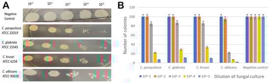 The suspensions were prepared from fresh Candida cultures, plated on agar plates, and incubated at 35 °C for 24–48 h. After incubation, we transferred roughly 4–5 yeast colonies (with a sterile loop) to a test tube containing 3 mL of 0.85% saline solution. The resulting suspensions were vortexed for 15 s. The final concentration obtained was 1–5 × 106 colonies.