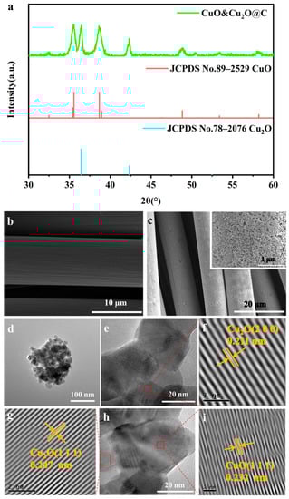 (a) XRD patterns of CuO&Cu2O@C; (b) SEM image of CC; (c) SEM images of CuO&Cu2O@C; (d) TEM image; (e–i) HRTEM images of CuO&Cu2O@C.