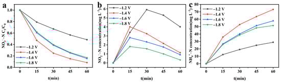 Electrochemical reduction of nitrate at different cathodic potentials. (a) NO3−–N concentration; (b) NO2−–N concentration; (c) NH4+–N concentration.