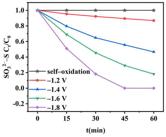 To investigate the electro-oxidation performance of SO32−–S on a Pt sheet electrode, a separate study of the electrochemical oxidation of sulfite was conducted, and self-oxidation experiments were conducted to eliminate the effect of air on sulfite oxidation. As shown in Figure 4, the SO32−–S concentration remained essentially constant during the self-oxidation, indicating that SO32−–S was not oxidized by air in the H-type sealed electrolytic cell. In addition, the oxidation of SO32−–S was all electrically driven during the electro-oxidation process. As the cathodic potential increased from −1.2 V to −1.8 V, the oxidation rate of SO32−–S increased from 13.5% to 100%; moreover, the oxidation was complete within 45 min at −1.8 V. This demonstrates that the Pt electrode possessed effective SO32−–S oxidization capability. The electro-oxidation process was fitted with a pseudo-first-order kinetic model, and the kinetic constants obtained for different cathodic potentials indicated that the electro-oxidation process of SO32−–S conforms to the pseudo-first-order kinetic process (Figure S2). As the cathodic potential increases, the kinetic constant of the electro-oxidation process of SO32−–S also increases, which is because at higher potentials, more electrons are generated, thereby accelerating the reaction rate [21].