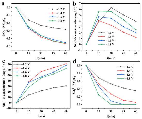 Effect of cathodic potential on the performance of integrated electrochemical systems. (a) NO3−–N concentration; (b) NO2−–N concentration; (c) NH4+–N concentration; (d) SO32−–S concentration. Experimental conditions: initial NO3−–N concentration = 100 mg L−1; initial SO32−–S concentration = 1.0 g L−1.