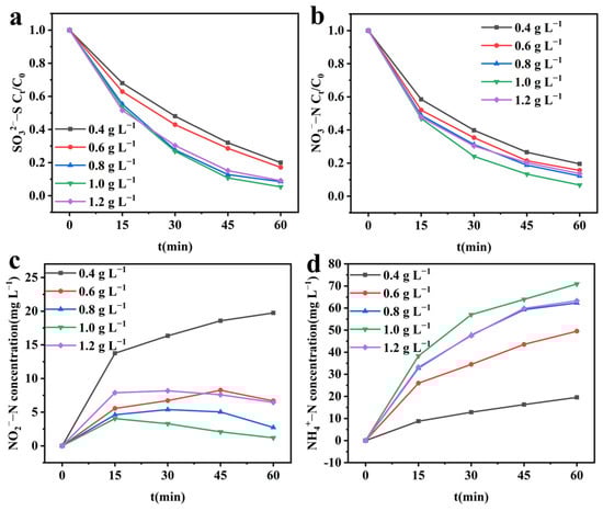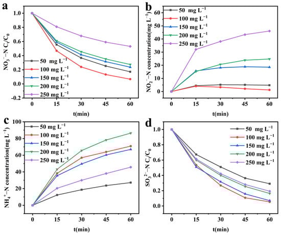 Figure 7c,d shows the changes of the products NO2−–N and NH4+–N at different initial SO32−–S concentrations, respectively. The accumulation of NO2−–N first decreased with the increase of initial SO32−–S concentration, reaching a minimum at 1.0 g L−1, and then increased with the further increase in SO32−–S concentrations. The NH4+–N production showed a trend of increasing and then decreasing, with the highest production at the initial SO32−–S concentration of 1.0 g L−1. This indicates that the decrease in the reaction rate during the cathodic reduction of nitrate leads to the accumulation of intermediate products, affecting the transformation of intermediate products to final products.
