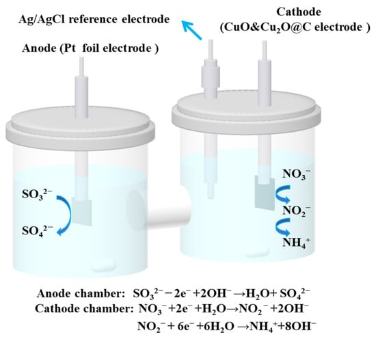 H-type electrolytic cell and SO32−, NO3− transformation process.