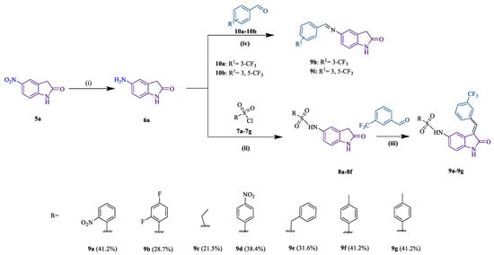 - Chaudhari, P.; Bari, S.; Surana, S.; Shirkhedkar, A.; Wakode, S.; Shelar, S.; Racharla, S.; Ugale, V.; Ghodke, M. Logical synthetic strategies and structure-activity relationship of indolin-2-one hybrids as small molecule anticancer agents: An overview. J. Mol. Struct. 2022, 1247, 131280. [Google Scholar] [CrossRef]
