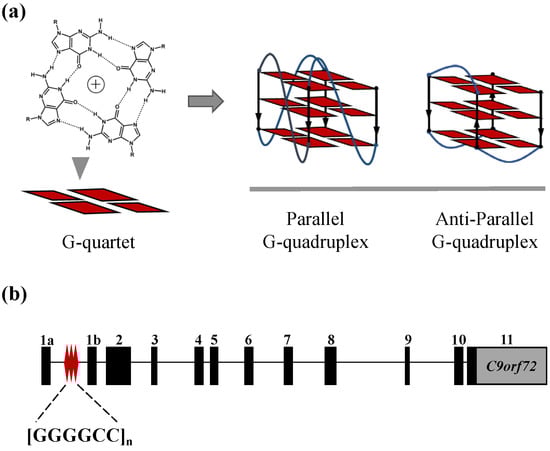 The C9ALS/FTD spectrum disorder represents two rare progressive neurodegenerative diseases. ALS is a fatal disease which is associated with the degeneration of motor neurons in the brain and spinal cord [21]. FTD is the second most common form of dementia in persons younger than 65 years of age, with characteristics of atrophy and neuronal loss in the frontal and temporal lobes of the brain [22]. ALS and FTD overlap extensively in their clinical presentation, pathology and, especially, genetics. They can both be caused by many mutations in the same set of genes, the most prevalent of which is a hexanucleotide repeat expansion (HRE) d(GGGGCC)n in the chromosome 9 open reading frame 72 (C9orf72) gene [23,24] (Figure 1b). The d(GGGGCC)n repeat is located in the promoter region of exon 1b in the C9orf72 gene, and it has been reported that while the repeat number is under 24 (n ≤ 24) in most healthy individuals, it extends to hundreds and even thousands in C9ALS/FTD patients [25]. The detailed mechanism of how C9-HRE causes C9ALS/FTD is still unresolved, but previous studies have proposed that C9-HRE could form polymorphic secondary structures, including GQs in DNA and RNA levels which disturb the transcription and translation processes, leading to the loss of C9orf72 protein, the accumulation of RNA foci and the expression of neurotoxic dipeptide-repeat proteins (DPRs) [26,27].