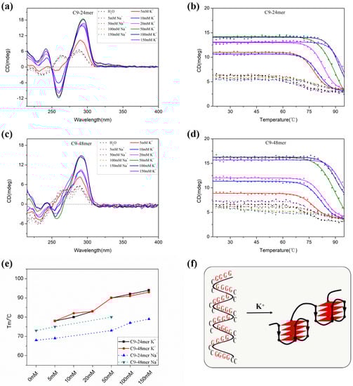 Previous NMR studies by Plavec’s group [37,38,39] have revealed that the short sequence C9-24mer, which represents the shortest model of C9-HRE able to form unimolecular GQ, mainly forms two major AP-GQ structures differing in the donor-acceptor directionalities of G-quartets in the presence of K+ ions. Here, we systematically investigated C9-24mer G-quadruplex formation under different monocation conditions through CD spectroscopy. As shown in Figure 2a, the CD absorption of C9-24mer in H2O and 5 to 150 mM Na+ solution are almost identical, with a negative absorption band around 236 nm, and two positive absorption bands around 263 nm and 288 nm, indicating the formation of mixed quadruplex structures containing GCGC tetrads, as the structure formation is insensitive to monovalent ionic conditions [43,44]. However, in the presence of 5 mM potassium ions, C9-24mer provides a CD spectrum with classic AP-GQ characteristics: a large maximum around 290 nm, a negative band around 260 nm and another small positive band around 240 nm [45]. Moreover, CD absorption increases significantly when the concentration of the potassium ions reaches 10 mM. Further increases of K+ concentration up to 150 mM give a slight absorption enhancement, indicating the strong K+ inducement of C9-24mer AP-GQ. It is notable that despite CD spectroscopy being a highly sensitive and reliable method to discriminate among various DNA secondary structures, it does not directly reflect strand orientation; therefore, the two AP-GQ topologies of C9-24mer in the presence of K+ ions resolved using the NMR method [38] cannot be distinguished by our CD experiment. To further evaluate the thermal stability of C9-24mer AP-GQ, we performed variable temperature measurement experiments. As shown in Figure 2b, the CD melting temperature of C9-24mer recorded at 290 nm in H2O or 5–150 mM Na+ solution (68 °C, 69 °C, 73 °C, 77 °C, 79 °C, respectively) is relatively lower than those in potassium solution, which is consistent with the CD absorption result that C9-24mer may form mixed structures consisting of GGGG and GCGC tetrads. However, in the presence of 5–150 mM K+ solution, the C9-24mer topology is much more thermally stable, with the CD melting temperature increasing gradually from 78 °C, 80 °C, 83 °C, 90 °C, 92 °C, to 94 °C, respectively, suggesting that C9-24mer can form a stable AP-GQ structure under near-physiological ionic conditions.