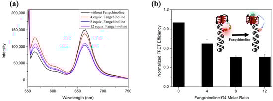 We also performed FRET experiments to confirm this result. The previously reported FRET system developed by Balasubramanine and others [48,49], which can sensitively distinguish between AP-GQ and P-GQ conformations, was applied to the C9-24mer sequence. We first evaluated whether the C9-24mer repeats attached with a 35 nt overhang duplex (FRET I + II) could form AP-GQ in 100 mM K+ solution using CD spectroscopy. As shown in Figure S4, the CD absorption of FRET I + II exhibits a broad positive peak around 290 nm, which indicates a combination structure of AP-GQ and duplex. As Fangchinoline was added to the solution, the broad positive peak shifteds to 265 nm, indicating the topology of the C9-24mer sequence in this system was altered to P-GQ, just as the free C9-24mer oligo was. Next, with the excitation wavelength set at 551 nm, the fluorescence emission spectra of I + II with varied equivalents of Fangchinoline were recorded. As shown in Figure 4a, the fluorescence intensity of the Cy5 emission at 670 nm decreased gradually as the molar ratio of Fangchinoline: (I + II) increased from 0 to 12, and the normalized FRET efficiency decreased to 0.67, 0.46 and 0.46, respectively (Figure 4b). This demonstrates that C9-24mer was induced to P-GQ by Fangchinoline, and thus caused an increase in the distance between the two dyes, Cy3 and Cy5, which gives a lower FRET efficiency, as illustrated in the Figure 4b inner panel.