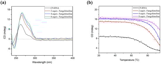 (a) The CD spectra and (b) CD melting curve of 5 μM C9-RNA with varied equivalents of Fangchinoline in 5 mM KCl, 30 mM Tris-HCl (pH 7.4) solution.