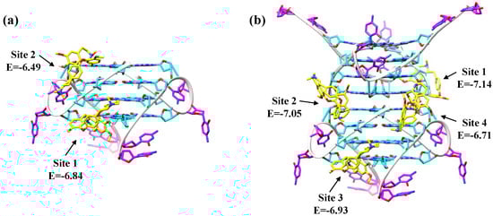 To get an idea of whether Fangchinoline could bind directly to C9-HRE AP-GQ and alter it into P-GQ, or if it binds to the unfolded C9-HRE and induces the formation of P-GQ simultaneously, we added Fangchinoline to the pre-generated C9-HRE AP-GQ solution without further annealing, and found no induced CD absorption around 260 nm (Figure S5), indicating that Fangchinoline should be a P-GQ rather than an AP-GQ binder. Based on this, we performed an in silico docking analysis using Autodock4.2 [50] to gain insight into the binding mode of Fangchinoline with the parallel C9-HRE GQ. Since an accurate NMR or crystal structure of the C9-HRE P-GQ formed by d(GGGGCC)4 is not available yet, the biological assembly structure of d(GGGGGCC)2 in K+ solution (PDBID: 7ECH) [41] resolved by crystallography was used to obtain the single C9-HRE P-GQ unit, which corresponds to C9-24mer GQ, and the stacked units, which corresponds to C9-48mer GQ. As the previously calculated stoichiometry of Fangchinoline with the C9-HRE GQ unit was approximately equal to two (Figure 3c,d), the docking conformations in the clusters with the lowest two or four binding energies were selected to show the most probable binding sites of C9-24mer or C9-48mer. As shown in Figure 6a, according to the docking results, Fangchinoline prefers to bind to the two-groove regions formed between two GGGG strands (Site 1) or a GGGG strand and a CC loop (Site 2) of the C9-HRE P-GQ unit; it binds in a similar pattern to the stacked dimeric C9-HRE P-GQs (Figure 6b), with two groove-binding sites formed between a GGGG strand and a CC loop (Site 1 and Site 2), and another two sites between adjacent GGGG strands (Site 3 and Site 4). Moreover, the module of the calculated binding energy of Fangchinoline with the C9-HRE P-GQ unit (−6.67 kcal/mol on average for Site 1 and Site 2) was lower than that with the dimeric P-GQs (−6.96 kcal/mol on average for Site 1 to Site 4), which is consistent with the previous binding constant result calculated by Hill fitting using the CD method, and may be caused by extra non-electrostatic interactions of Fangchinoline with the interface groove regions in the dimeric P-GQs (Figure 6b, Site 1 and Site 2). However, it should be noticed that the conformational flexibility is not modeled in the in silico docking process, and thus the precise interaction and the complex conformation still need further exploration using either molecular dynamics (MD) simulations, as described by Gil’s and Bhowmik’s groups [51,52,53,54], or NMR and crystallography studies.