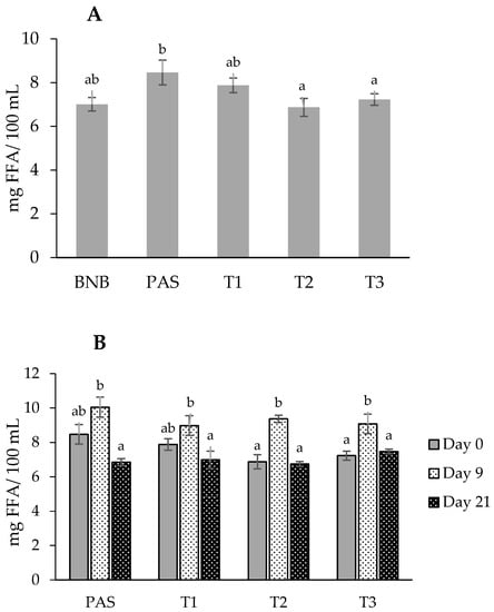 | 21 | 7.9 ± 0.5 a | 7.4 ± 0.1 b | 7.1 ± 0.2 a | 6.8 ± 0.4 a | ||