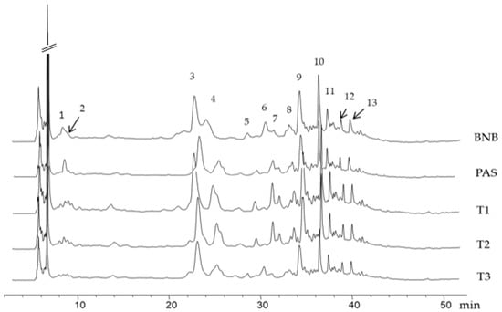 | Peak | Phenolic Compound | RT (min) | BNB | PAS | T1 | T2 | T3 | ||||||||