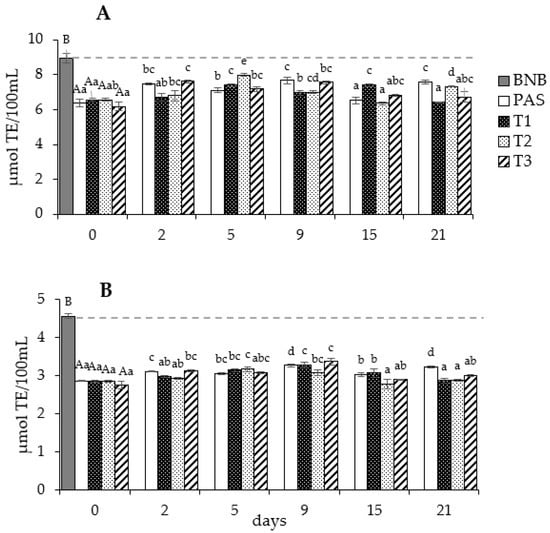 | Tocopherol | 0 | 10.4 ± 0.5 B | 7.4 ± 0.3 Aa | 7.5 ± 0.1 Ab | 7.1 ± 0.2 Aa | 6.7 ± 0.2 Aa |