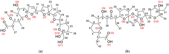 Chemical structure and numbering scheme of carbon (black) and oxygen (red) atoms in (a) monensic acid (MonH) and (b) salinomycinic acid (SalH).