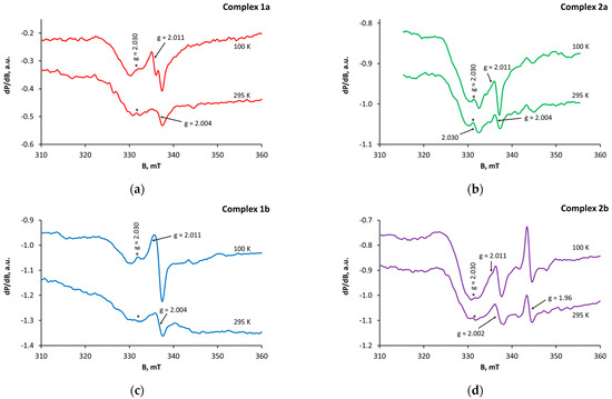 X–band solid-state EPR spectra of complexes (a) 1a; (b) 2a; (c) 1b; (d) 2b at 295 and 100 K.