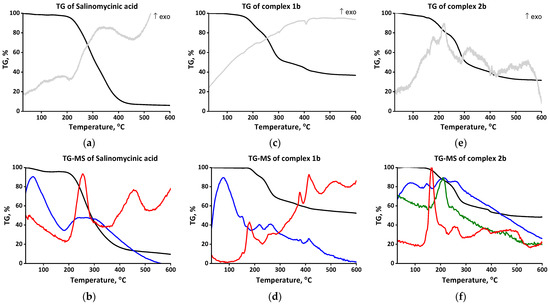 TG–DTA (up) and TG–MS (bottom) curves of SalH (a,b) and complexes 1b (c,d)/2b (e,f). Color code: weight decrease (black); endo- and exothermic effects (grey); H2O loss (blue); CO2 loss (red), NO loss (olive).