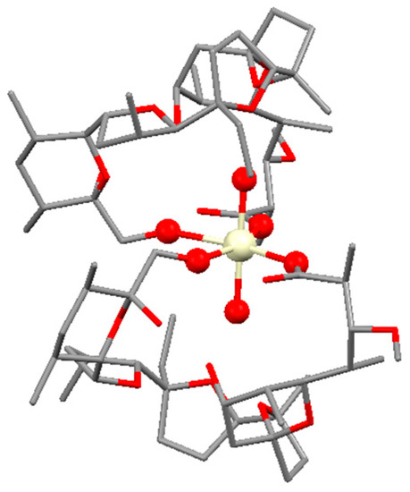 In the last few decades, some representatives of the polyether ionophores group have become a subject of increasing scientific interest. They are natural antibiotics that undergo pseudo-cyclization since the carboxylic group takes part in intramolecular hydrogen bond formation with the hydroxyl group(s) at the opposite end of the molecule. Thus, the formed cavity is highly hydrophilic and can host an alkaline cation or a water molecule. In addition to their main application—the treatment of parasitic disease coccidiosis—the polyether ionophores are also thought to possess anticancer activity and antibacterial effect [14,15,16,17,18,19,20,21,22,23,24]. These findings make them attractive compounds when searching for new applications of already-known therapeutics. Some of the attempts at improving the activity of this antibiotic class are focused on functionalizing the carboxylic group, in some cases followed by further complex formation [25,26,27,28,29]. An alternative approach is to use the native ionophores as ligands directly to obtain various metal complexes. Both pathways have proven to be possible and reliable tools for enhancing the biological activity of parent compounds.