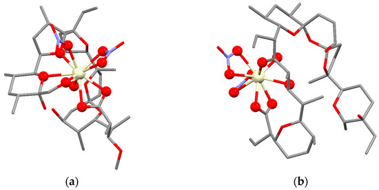 Combining the spectral properties of 2a–b with elemental analysis data, we suggest that cerium(IV) cation is bound to three types of ligands—ionophore, nitrate and hydroxide anions. Their potential multiple binding variances do not allow the construction of an initial structure to be further optimized by the DFT approach. For that reason, we applied molecule dynamics accompanied by subsequent quantum chemical calculations (for details, refer to Section 3.4). A total of eight (monensin) and three (salinomycin) conformers were sufficiently populated at 298 K (0.1–39.3%, 2a; 19.7–47.7%, 2b) after cluster analysis and DFT optimization. These structures were used for vibrational spectra calculations and the determination of donor atoms set that comprises the primary coordination shell of 2a–b.