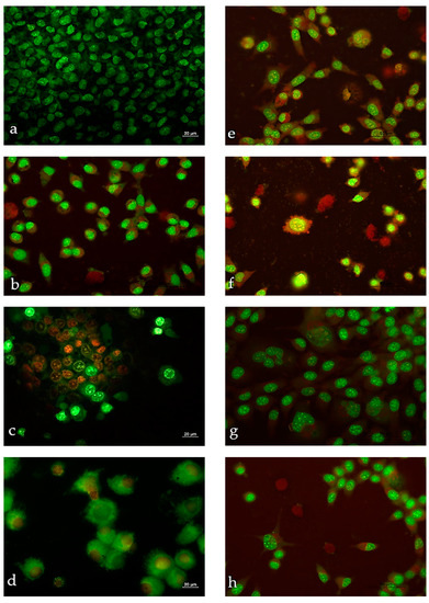 Cytopathological changes in HeLa cells after double staining with AO/PI (72 h): (a) untreated cells; (b) MonH × H2O—0.5 mg/mL; (c) MonH × H2O—1 mg/mL; (d) MonH × H2O—5 mg/mL; (e) SalH—0.5 mg/mL; (f) SalH—1 mg/mL; (g) 2a—0.5 mg/mL; (h) 2b—0.5 mg/mL (bar = 20 µm).