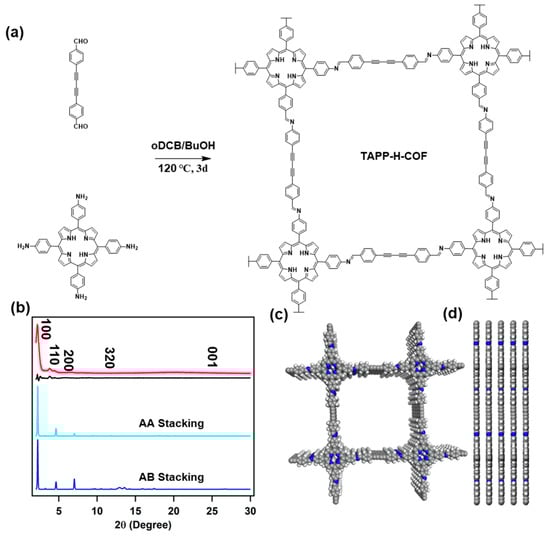 (a) Schematic of the synthesis of TAPP-H-COF. (b) Observed PXRD pattern (red) and profiles simulated using the Pawley refinement (pink circles) and their difference (black), AA-stacking (cyan), and staggered AB-stacking (blue) modes of the TAPP-H-COF. Model structures of TAPP-H-COF: (c) Top view and (d) Side view.
