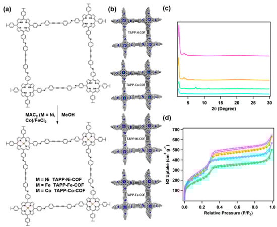 (a) Schematic of the synthesis of TAPP-x-COF. (b) Unit cell structures of TAPP-H-COF and TAPP-x-COF in top view. (c) Powder XRD patterns of TAPP-H-COF (pink), TAPP-Co-COF (green), TAPP-Fe-COF (cyan), and TAPP-Ni-COF (orange). (d) Nitrogen adsorption (filled circles)–desorption (open circles) isotherms.
