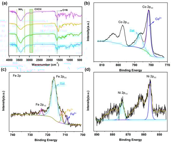 (a) FT-IR spectra of TAPP-H-COF (pink), TAPP-Co-COF (green), TAPP-Fe-COF (cyan), and TAPP-Ni-COF (orange). High-resolution XPS spectra of Co 2p for TAPP-Co-COF (b), Fe 2p for TAPP-Fe-COF (c), and Ni 2p for TAPP-Ni-COF (d).